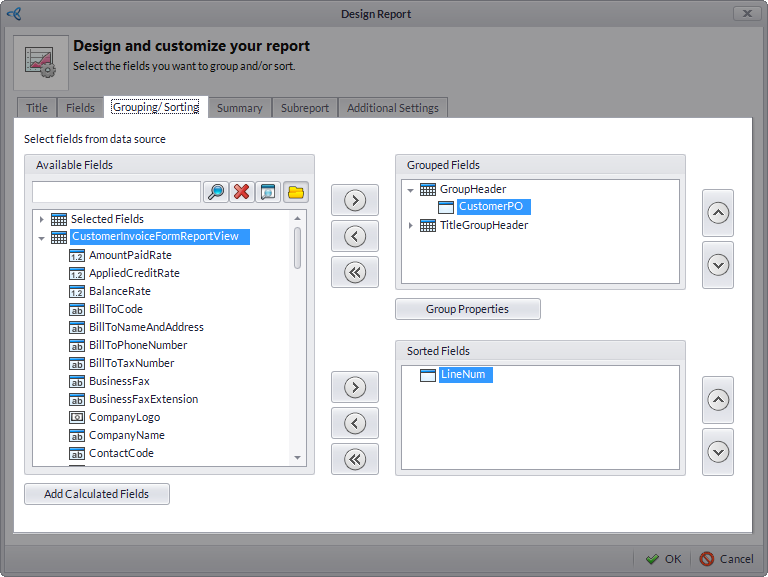 Field Name Description Available Fields This displays the Selected Fields, Calculated Fields and Column Fields of the selected report data source. Grouped Fields Displays the collection of fields used as a criteria for creating groups in a report. Group Properties Allows you to set the group header band properties for a group of data. The Group Properties window will display when you click on the Group Properties button.