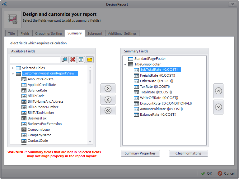 On this tab, you can select the fields you want to add as summary fields. You can also add summary fields to a report that requires calculation.