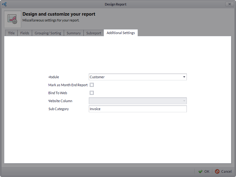 Field Name Description Module Select which module the report will be used. Mark As Month End Report Indicates that the report is a month end report. Bind to Web Indicates that the report will be used in the eCommerce. Website Column Indicates if a column is created from a website. Sub Category Add a sub category to the report.