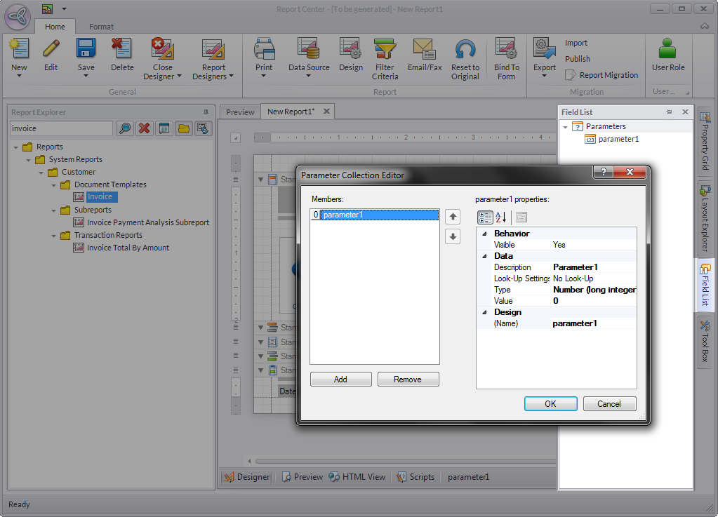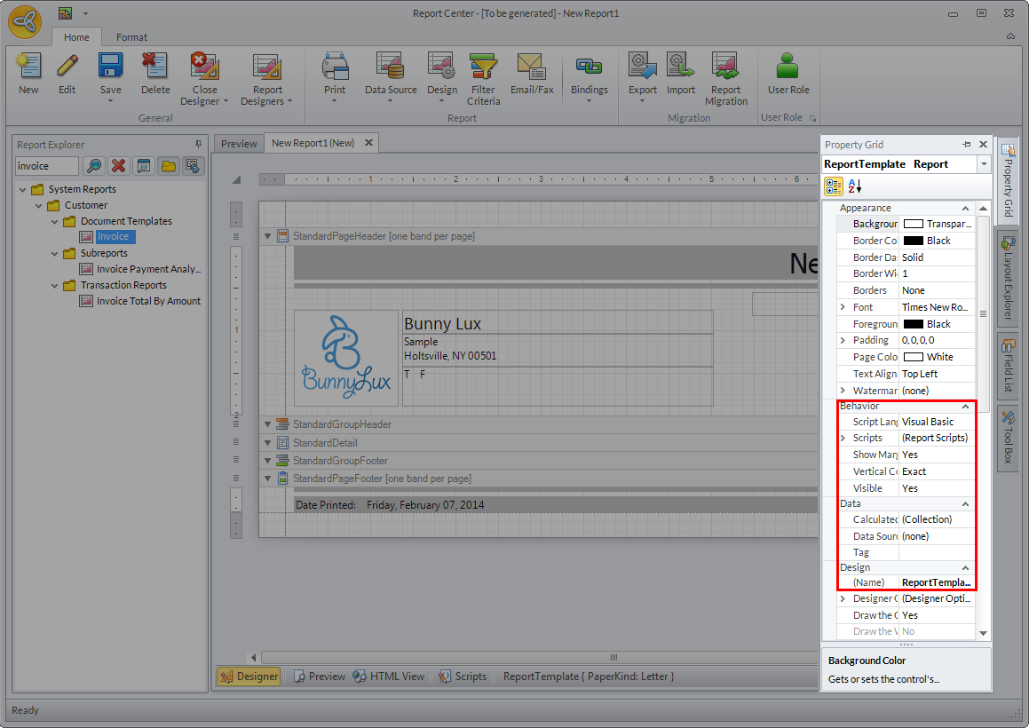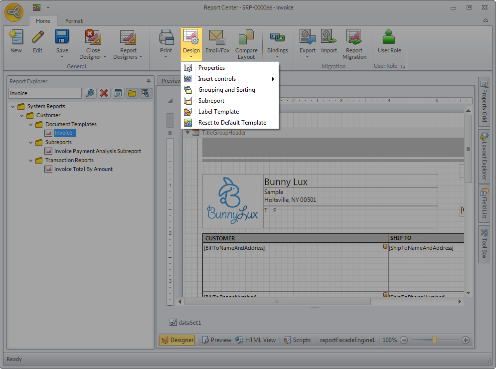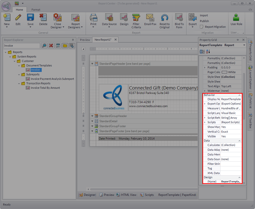 Report Designing is the action of creating a document to present information. In Connected Business, this process revolves around the Report Center where the all the necessary design tools, settings, and options are available. These provide an easy way to either modify the content of an existing report or design one using a pre-existing template.