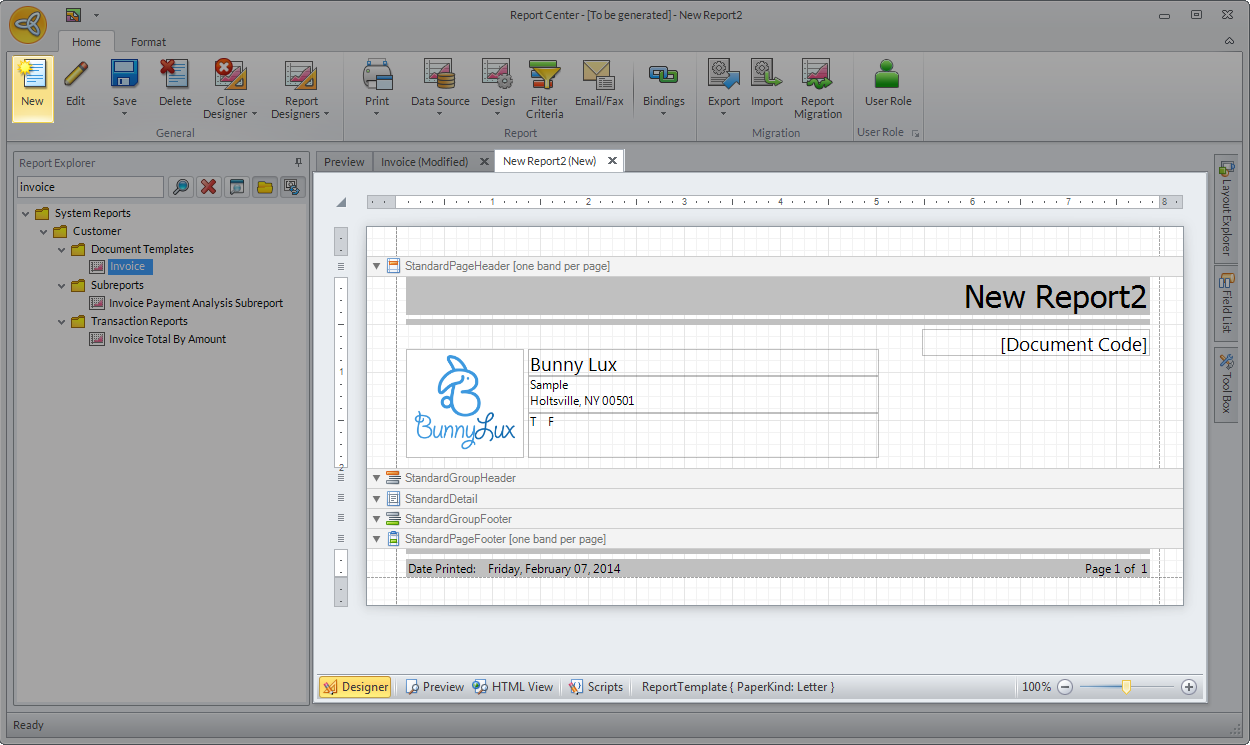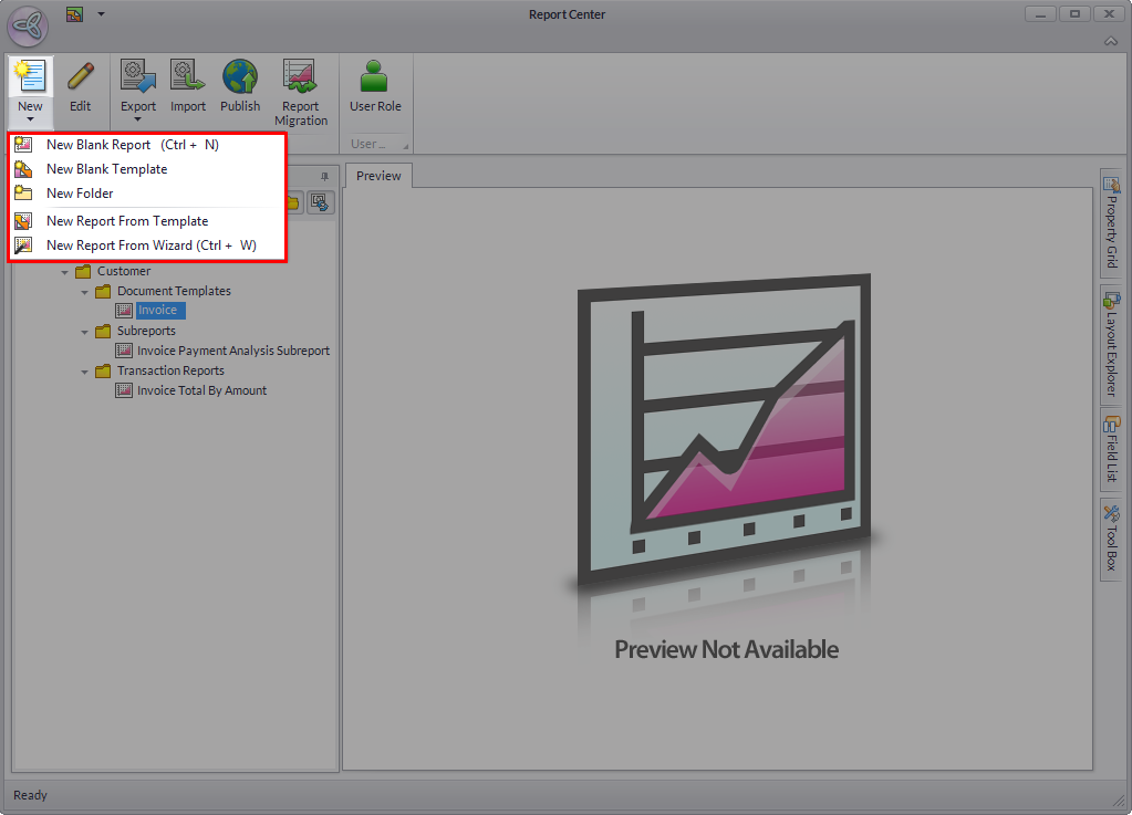 - Go to the Report Center from any module. Select a report from the Report Explorer pane and click Edit to reveal the Report Ribbon Menu items. Alternatively, simply click New.