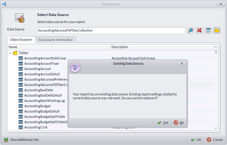 Replacing a Data Source this way might affect the current report settings and may cause some Data- Source related settings to not work properly.