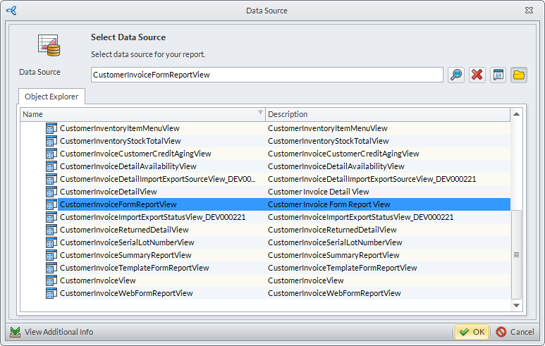- Click the Data Source button in the ribbon and choose from Tables, Views, and Stored Procedures. The Data Source form will be displayed.