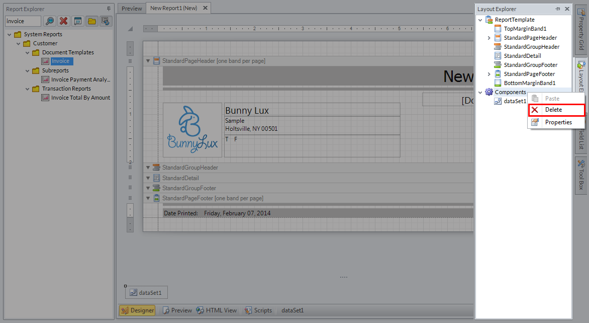 - Right click the Components report element and select Delete. This will remove the associated Data Source, allowing the user to assign a new one.