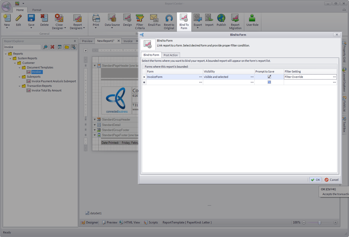 - Click the ellipsis under the Form field to select which form to bind the report to. Set the values for the Visibility and Filter Setting Fields, as well as set whether a Prompt to Save will occur. Click OK toapply changes and continue.