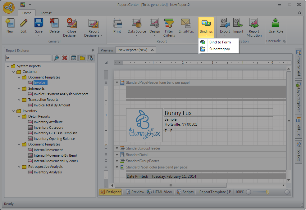 Binding a report to a form means that you are linking the designed report to a business process (e.g. the Sales Order Report to the Sales Order Business Process and the respective form). This ensures the correct and orderly presentation of relevant business process information. Please refer to the Bind Custom Report to Form documentation for more details.