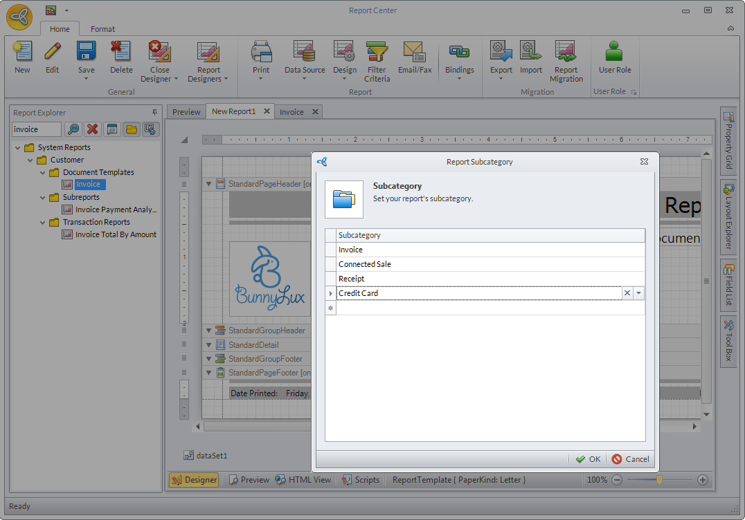 - On the Report Center ribbon, go to Bindings > Subcategory. The Report Subcategory form will be displayed.