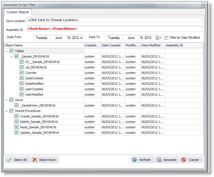 - Open MS SQL Server Management Studio > Right click on any IS Database (with custom objects). The Generate Script Filter form loads.
