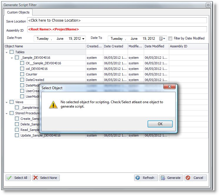 The Save Location field only accepts ‘DataDictionaryScript.sql’ file. Please make sure to have the right location of the file so that the AssemblyID will be auto-generated.