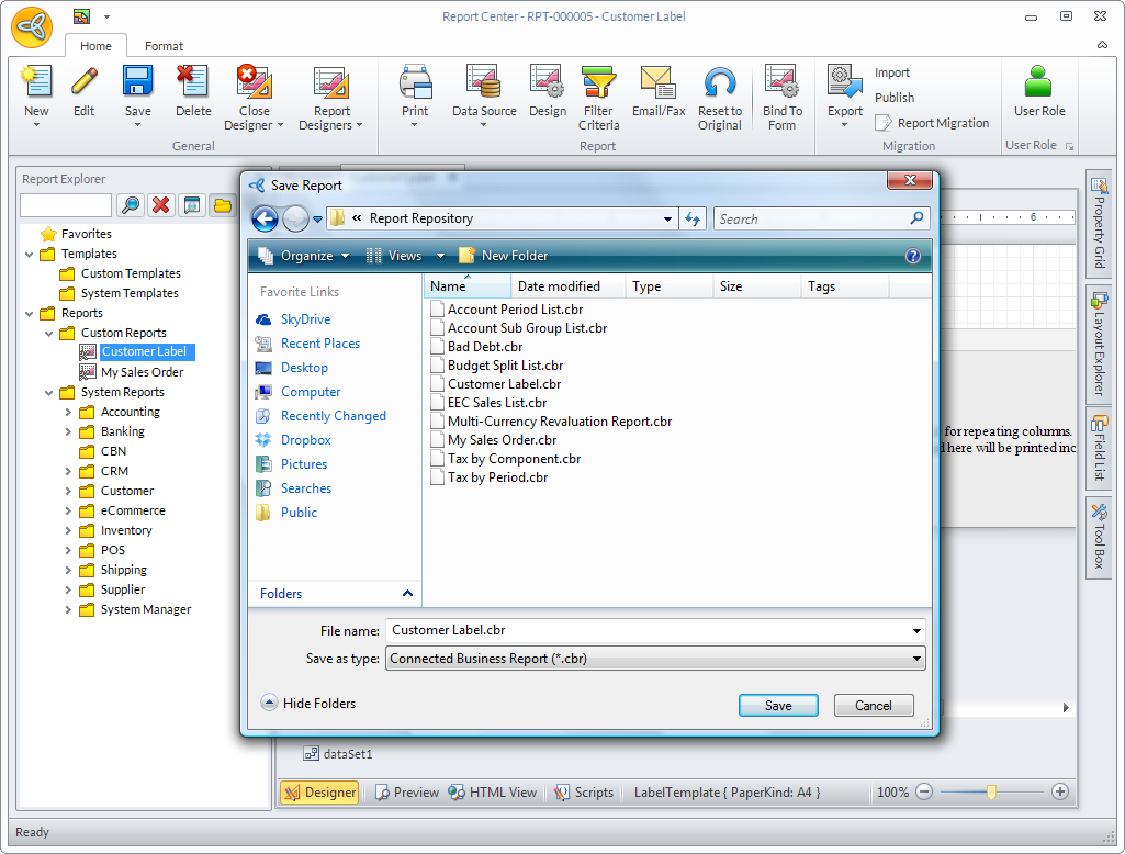 The Export function in Connected Business Report Center allows you to convert reports into CBR file format. The CBR file format is the only format readable by Connected Business report system. There are two ways to export Connected Business reports: