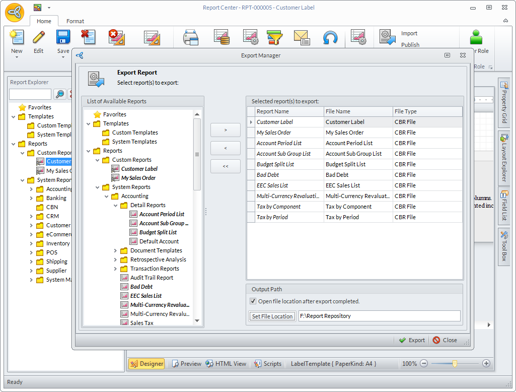 You may export multiple reports, change the filename of the reports selected or set a specific file location of the selected reports in a single process through the Export Manager. Using the Export Manager, you no longer need to open a specific report to export them, follow the steps below on how to export multiple reports.