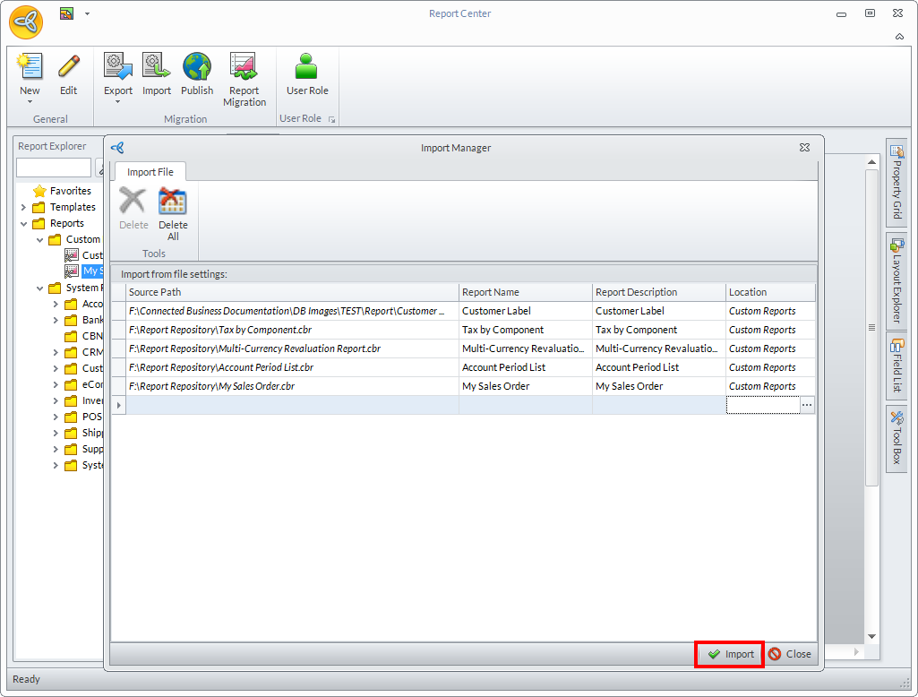 The import function allows you to import single or multiple CBR-file-format reports from your local folder to Connected Business Report Center.