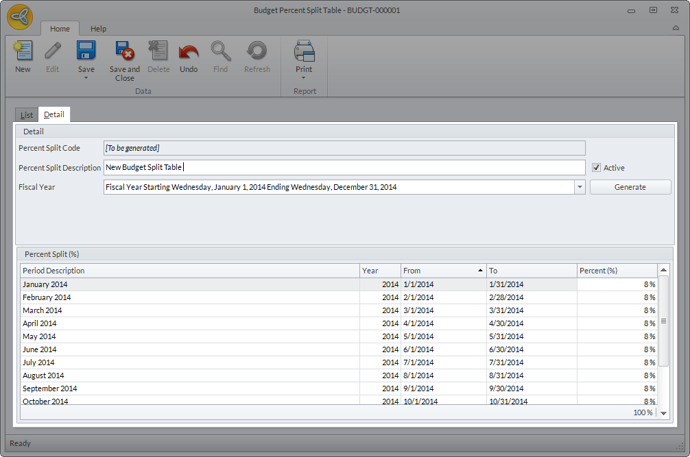 Budget Split Tables allocate the percent values across the accounting fiscal period. This is ideal for seasonal businesses. To create a new budget split table,