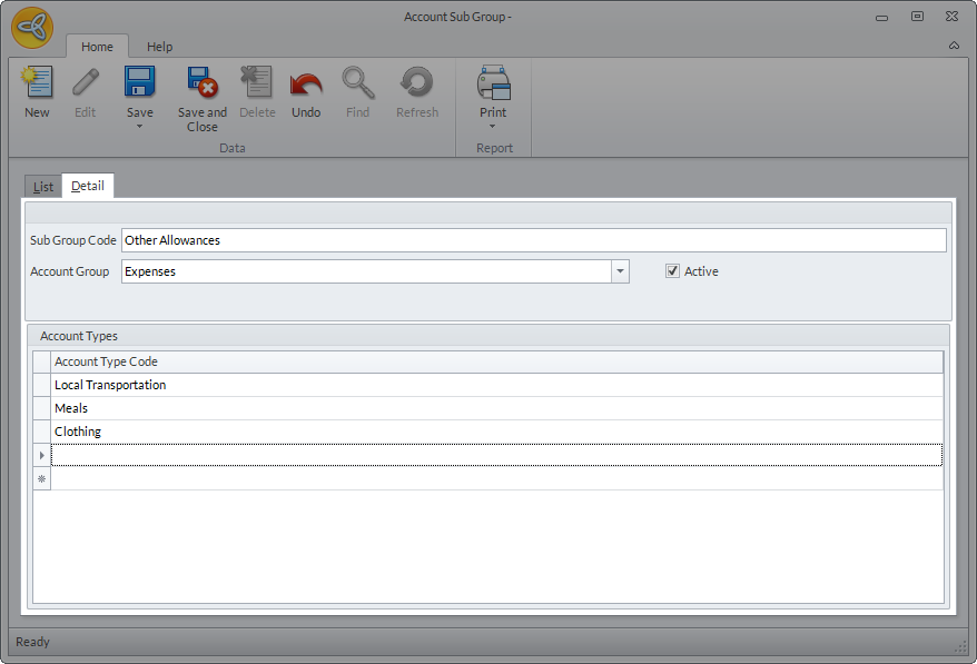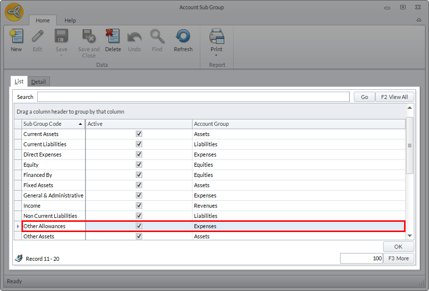 - Click New from the menu and enter the details for the new account sub group such as the Sub Group Code and Account Group.