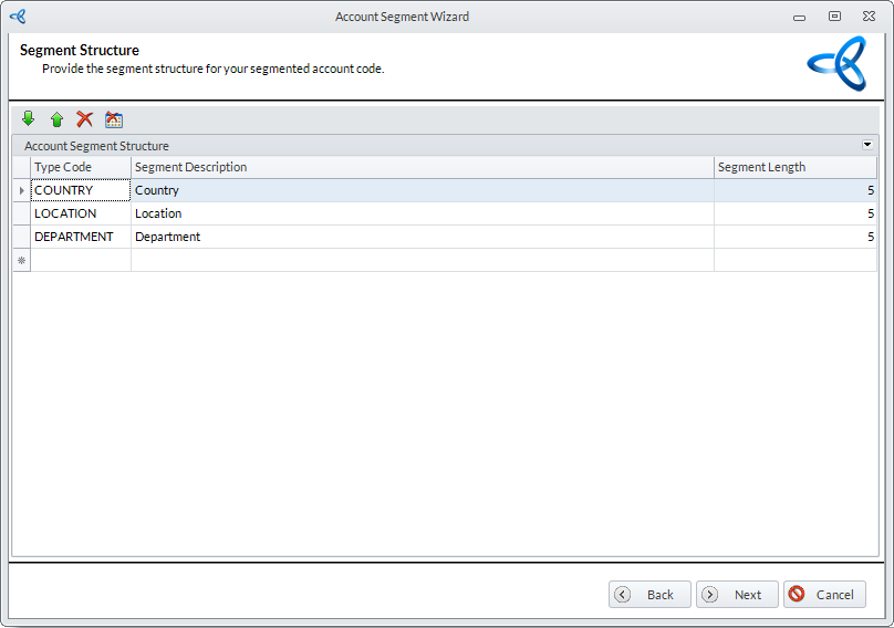 Go to Accounting module > Setup > Account Segments. The Account Segment Wizard will be displayed. Click Next to proceed.