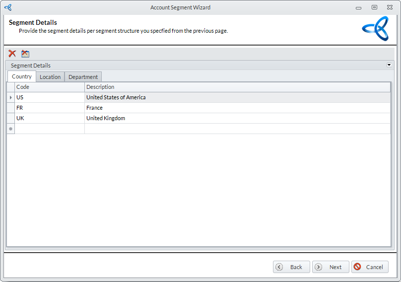 In the Segment Details screen, enter the segment values for each segment type. Provide the Segment Code and Description for each segment value. Click Next button to continue.