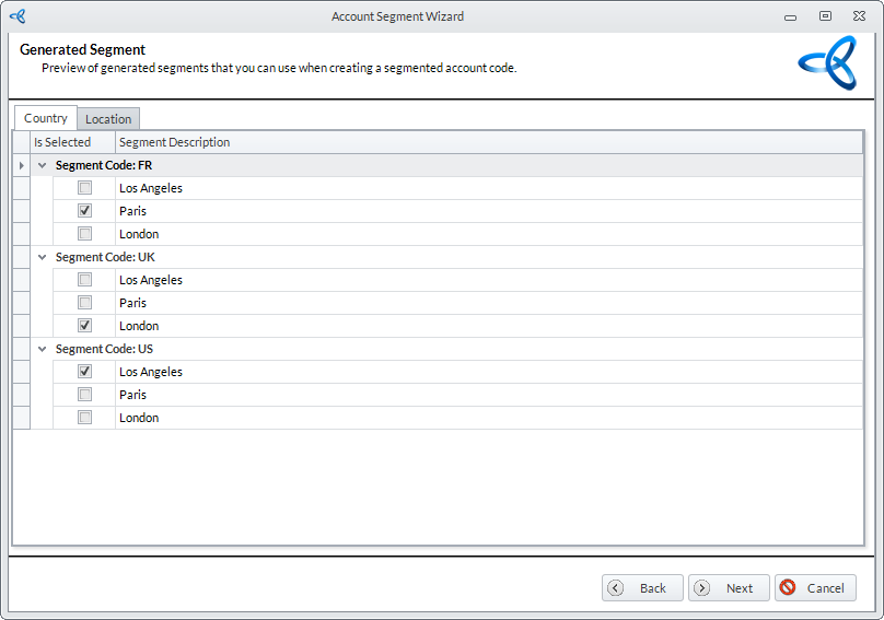 This step allows you to select the segment combinations that actually go together so you won't end up with invalid account codes. Select segment combinations by clicking on the checkbox next to the segment value. Click Next and Finish to generate the account segments.