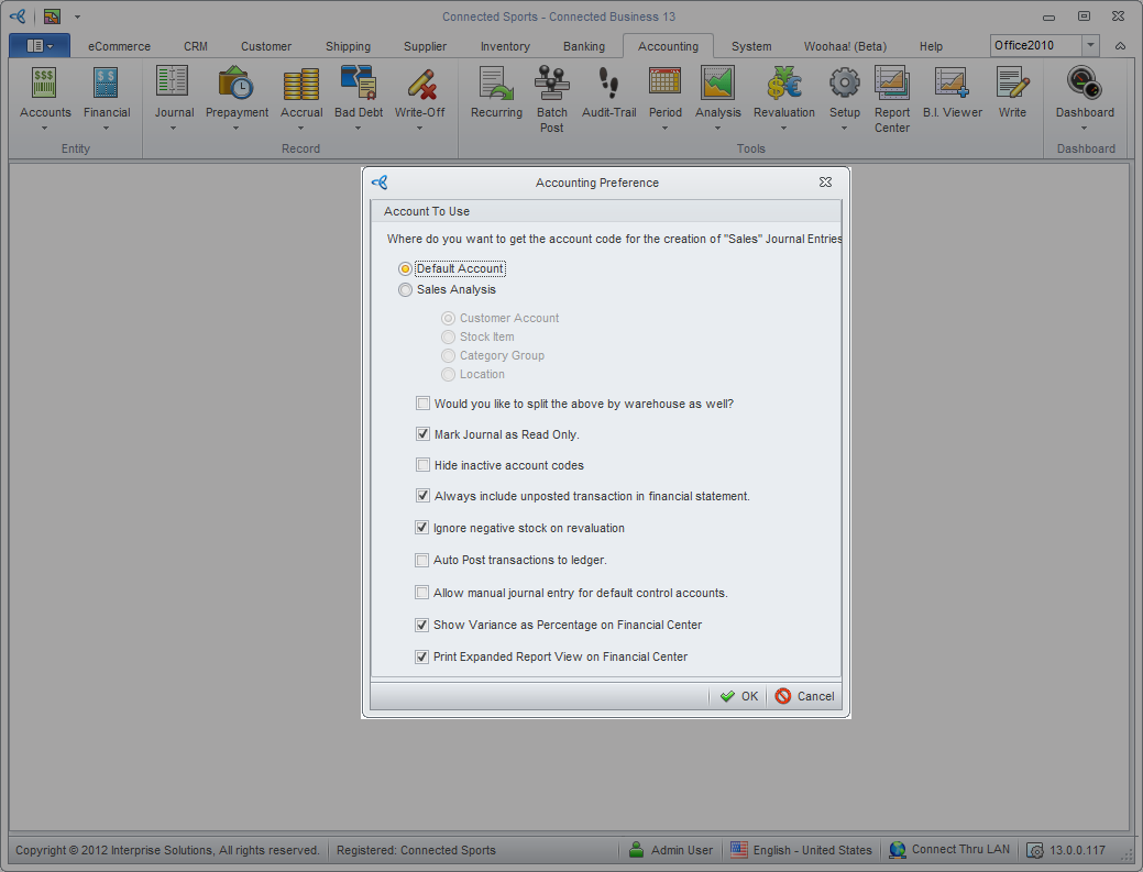 Allow Manual Journal Entry for Default Control Accounts | This option restricts users from creating manual entry to GL accounts being used by the system to generate journal. Upon upgrade from Interprise Suite 6 to Connected Business 13, the Allow manual journal entry to default control accounts is disabled in the Accounting preferences. * If checked – allows you from creating manual journals using the Default Accounts. However, the system will only compute the totals created from the transactions forms. In effect, it will not allow you to compare your financial statements to your reports as the totals may no longer match. * If unchecked – it will not allow you from creating manual journals using the Default Accounts. |