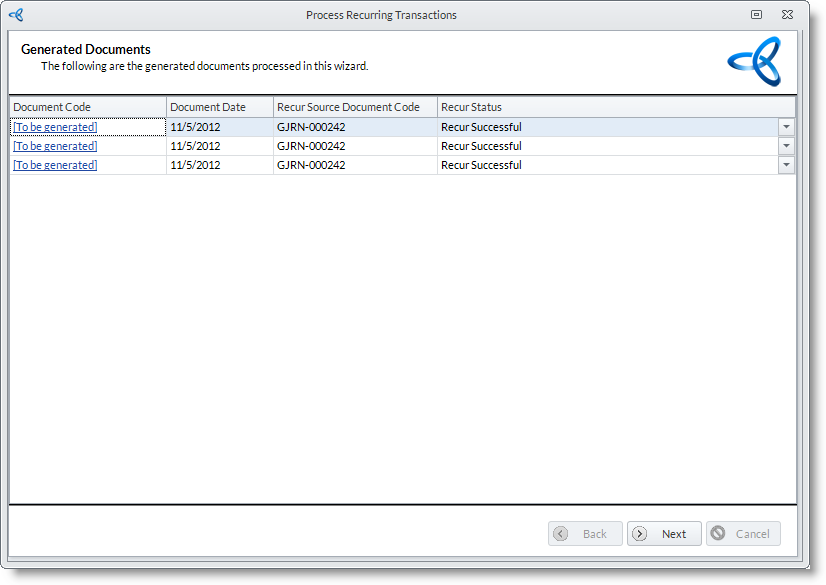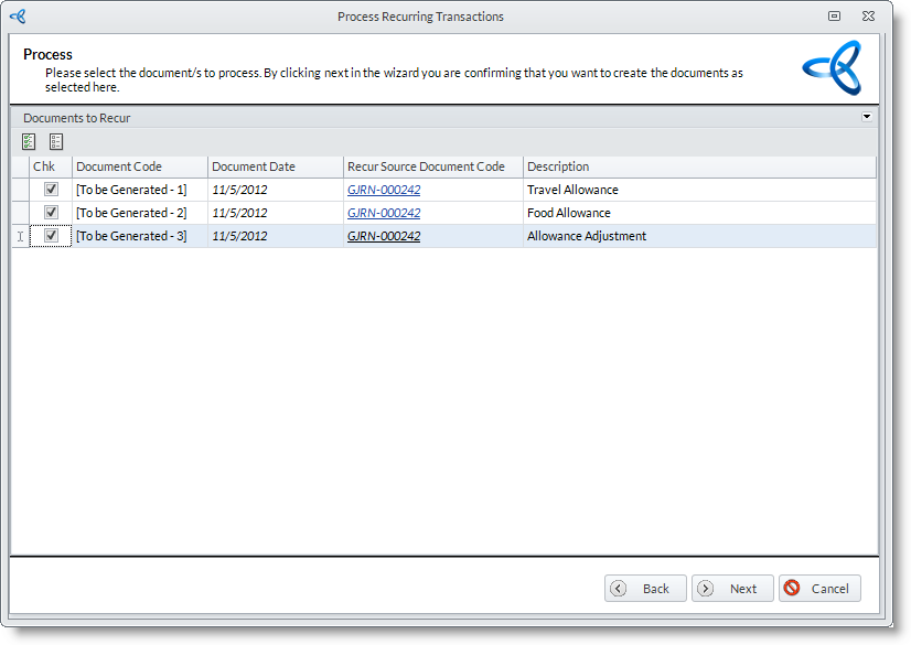 - Select the recurring document in the list(double click on the recurring document or documents). The Process Recurring Transaction Wizard will be displayed.
