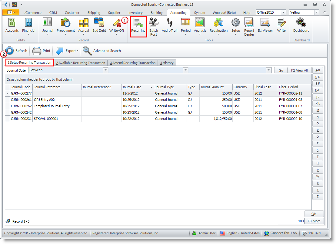 You can use the Recurring Transaction option to set up and process recurring journals. Regular or repeat orders are easily processed through this option.
