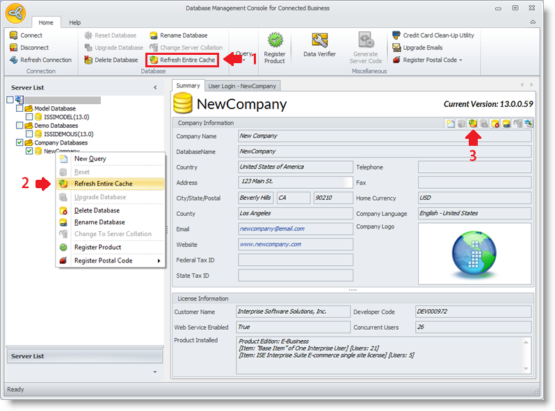 - Click on Refresh Entire Cache button (1)in the toolbar menu. Alternately, you can use the right click menu and select Refresh Entire Cache (2) or click on the Refresh Entire Cache icon (3) in the Database Summary section.