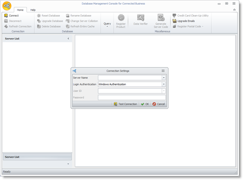 - Open the DBMC Connection window. Go to Start > All Programs > Interprise Solutions > Connected Business 13 > Tools > Connected DBMC 13. The DBMC Connection window will be displayed.
