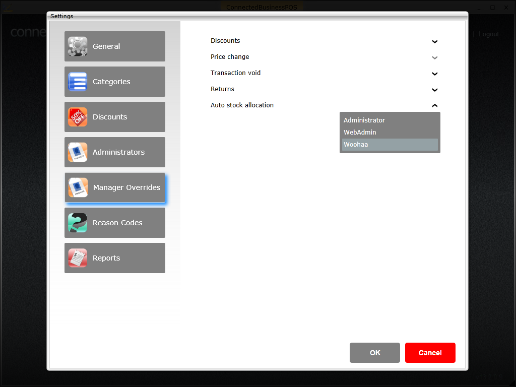 Each user can have the right to override specific POS transactions such as discounts, price changes, etc. when their user role is added as Administrators.