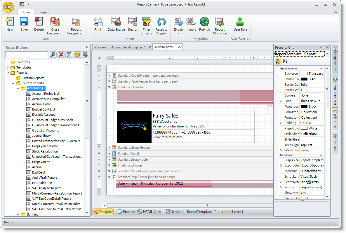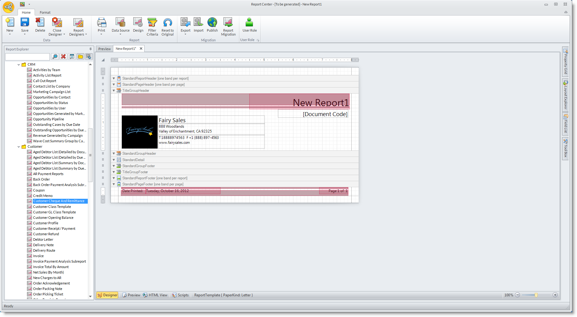 - Click on the Report Designer button from the Data menu group. Editing options for your selected report will be available.
