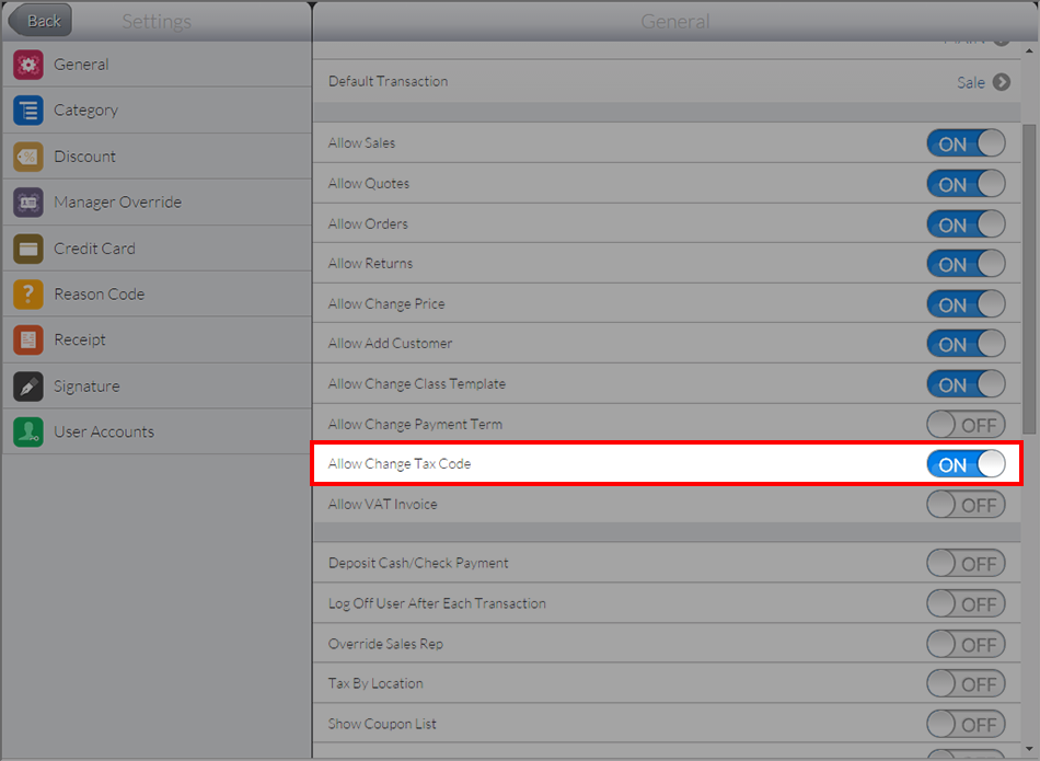 To allow for tax code changes while processing sales, you need to go to Settings and search for the control labeled Allow Change Tax Code. Turn the controls ON to enable the POS to assign different tax codes.