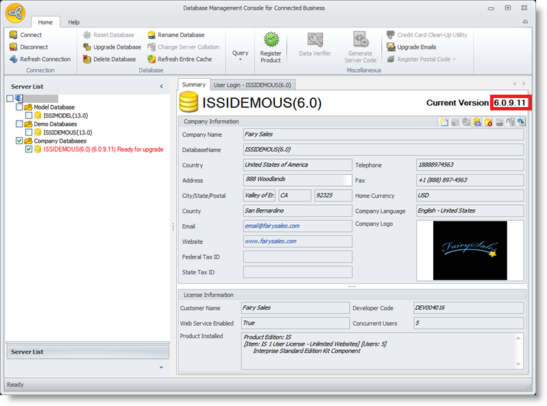 The databases that need to be upgraded are marked as “Ready for upgrade”. - Select the database to upgrade and click on the Upgrade Database button on the toolbar menu. Alternately, you can use the right-click option and select the Upgrade Database. Use default values if you want to start working with Connected Business right away.
