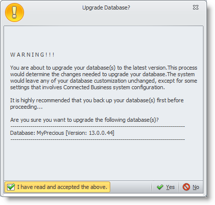 - A pop-up window will show advising you to create a backup for your database. Confirm that you have created a backup by ticking the checkbox "I have read and accepted the above." note and clicking Yes to proceed to with the upgrade.