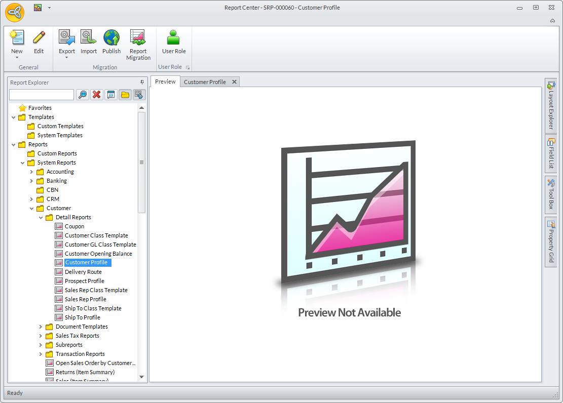 The Report Center Interface has all the essential report publishing tools that you need to print, modify or create custom report layouts.