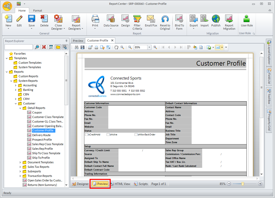 To modify the report layout, click once on the report in the Report List. Then click on the Report Designer button. The Report Designer window would display the report and may customize it therein.