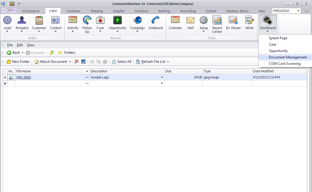 The Document Management dashboard allows you to keep your documents organized and in one place. This feature allows reliable safekeeping of files in the database to make it more accessible for users connecting remotely to Connected Business.