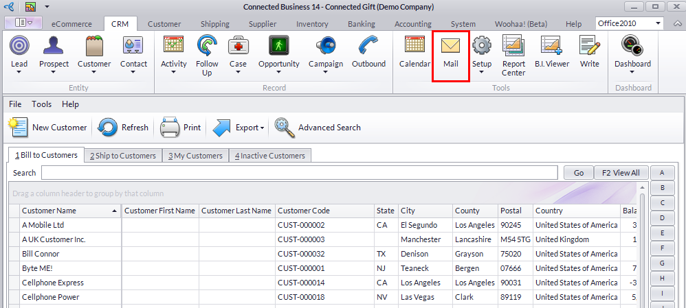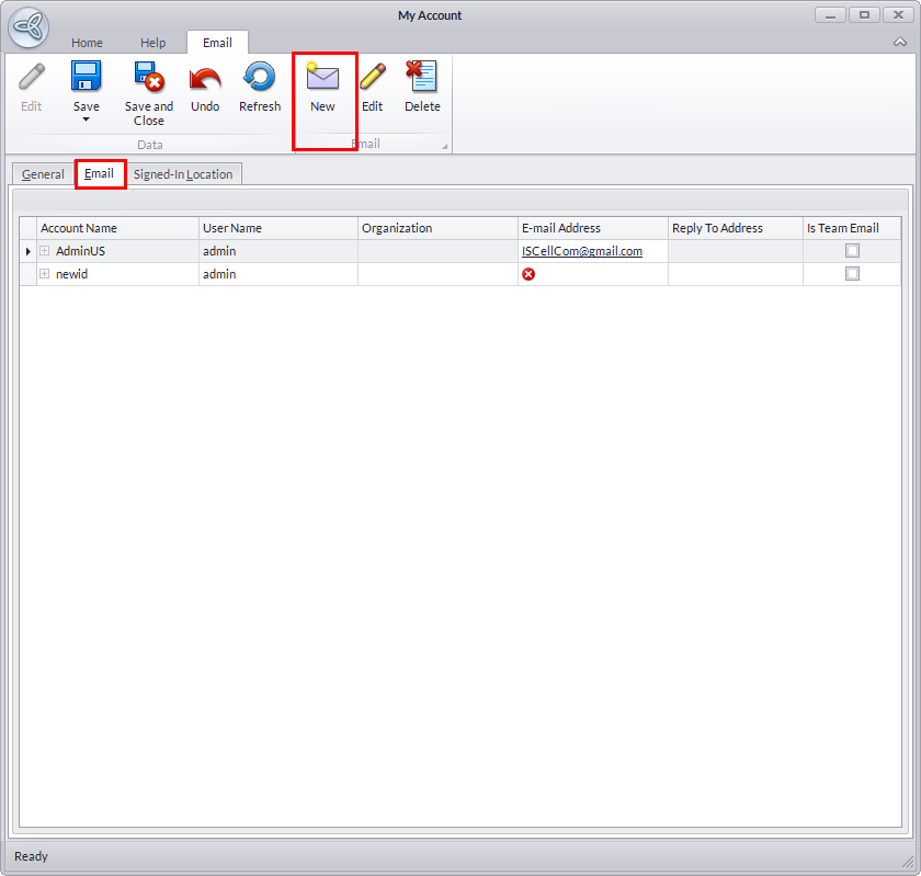 - In the Connected Business Email form, click on the email account you will use from the Folder List. Then click on the New button and select Email. The Email Composer will display.
