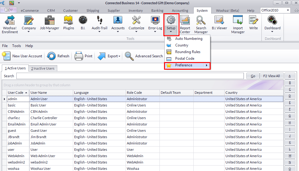 - Select Preference under the Setup menu of the System Manager module.