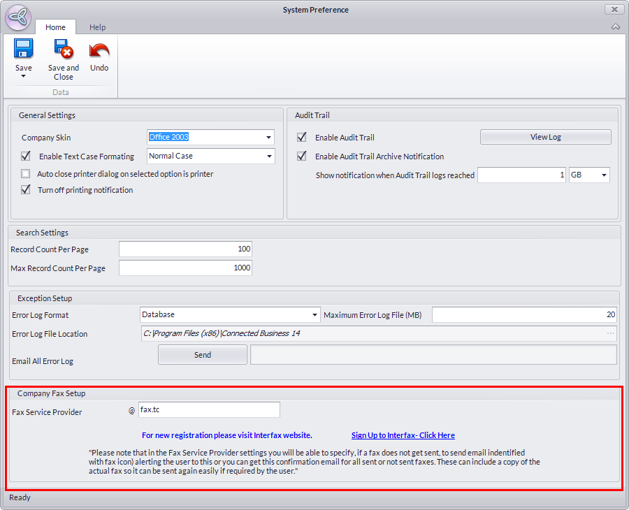 - In the Company Fax section of the System Preferences form, you will find a link to the registration page of InterFAX for Connected Business users.