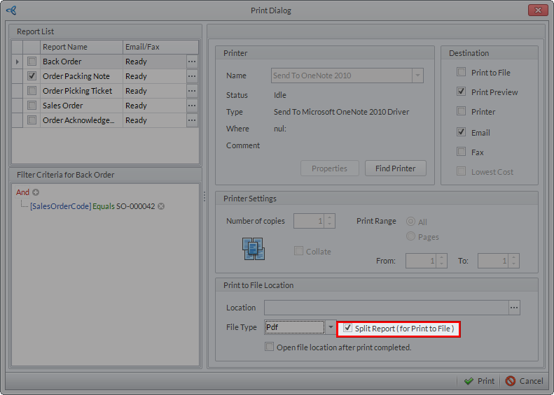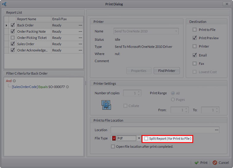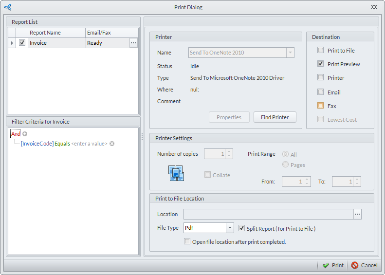Print to File | When checked, the system allows you to export the file into different file formats. On the Print to file Location, select the location you want the report to be saved. The file type includes pdf, excel, rtf, image, html. |