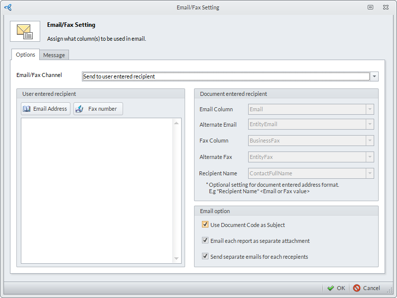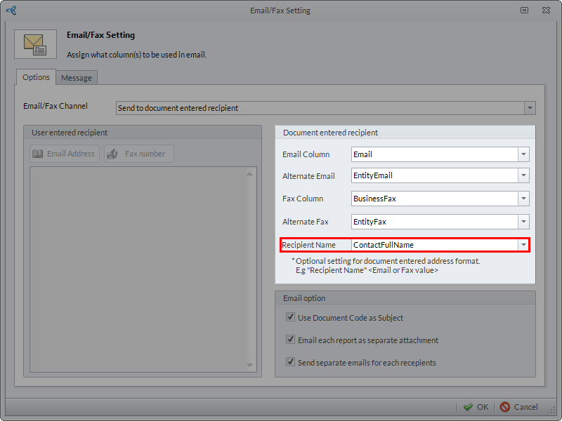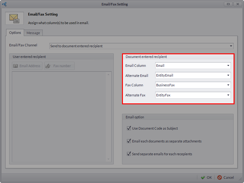 Send to Document Entered Recipient | Activates the Document Entered Recipient pane. Allows the user to set the recipient/s based on the data source. |