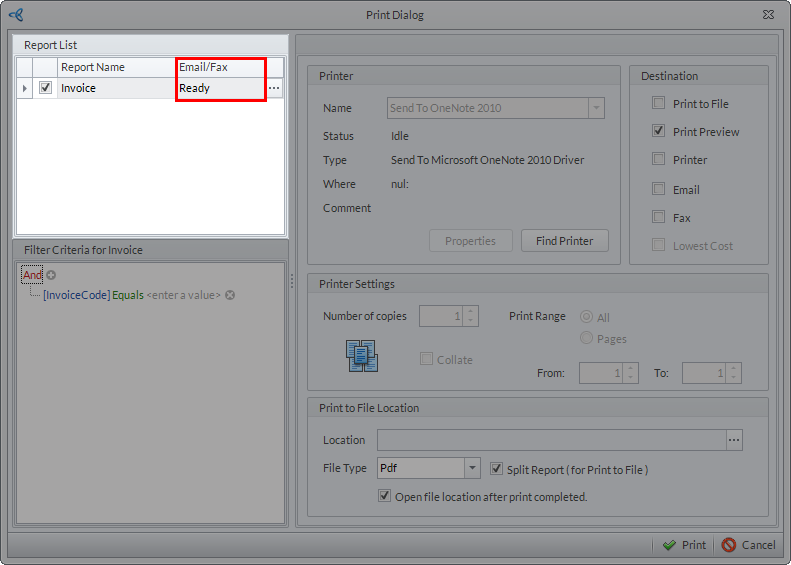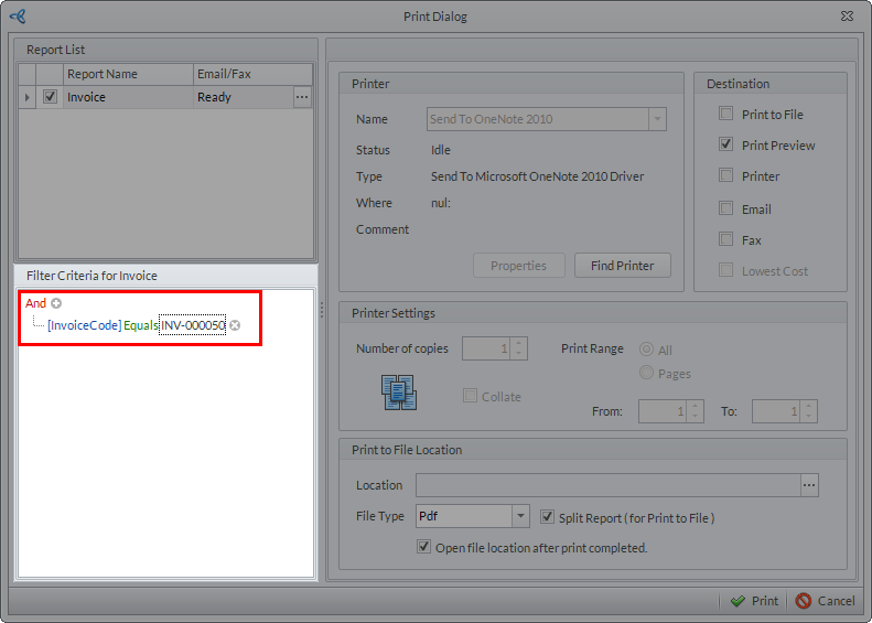 The system sets default criteria for every print dialog window of a form. It is highly recommended NOT TO delete the existing criteria to avoid errors in printing the report.