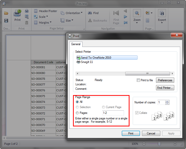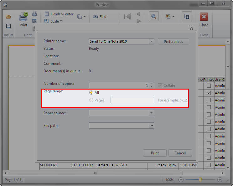 In Connected Business v14, this has been simplified, where you can choose either to print All Pages or specify which page to print.