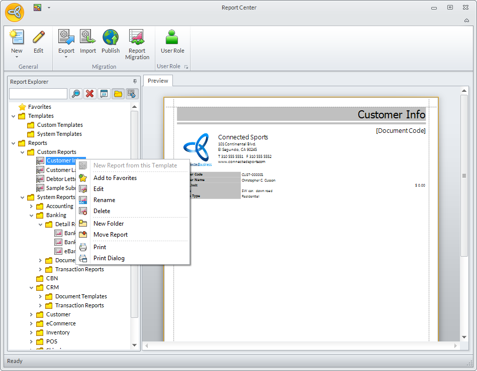 The Report Explorer lets you manage all the reports available in your Connected Business set-up. Upon accessing the Report Center from your respective module, the Report Explorer becomes available for you to use its respective functions.